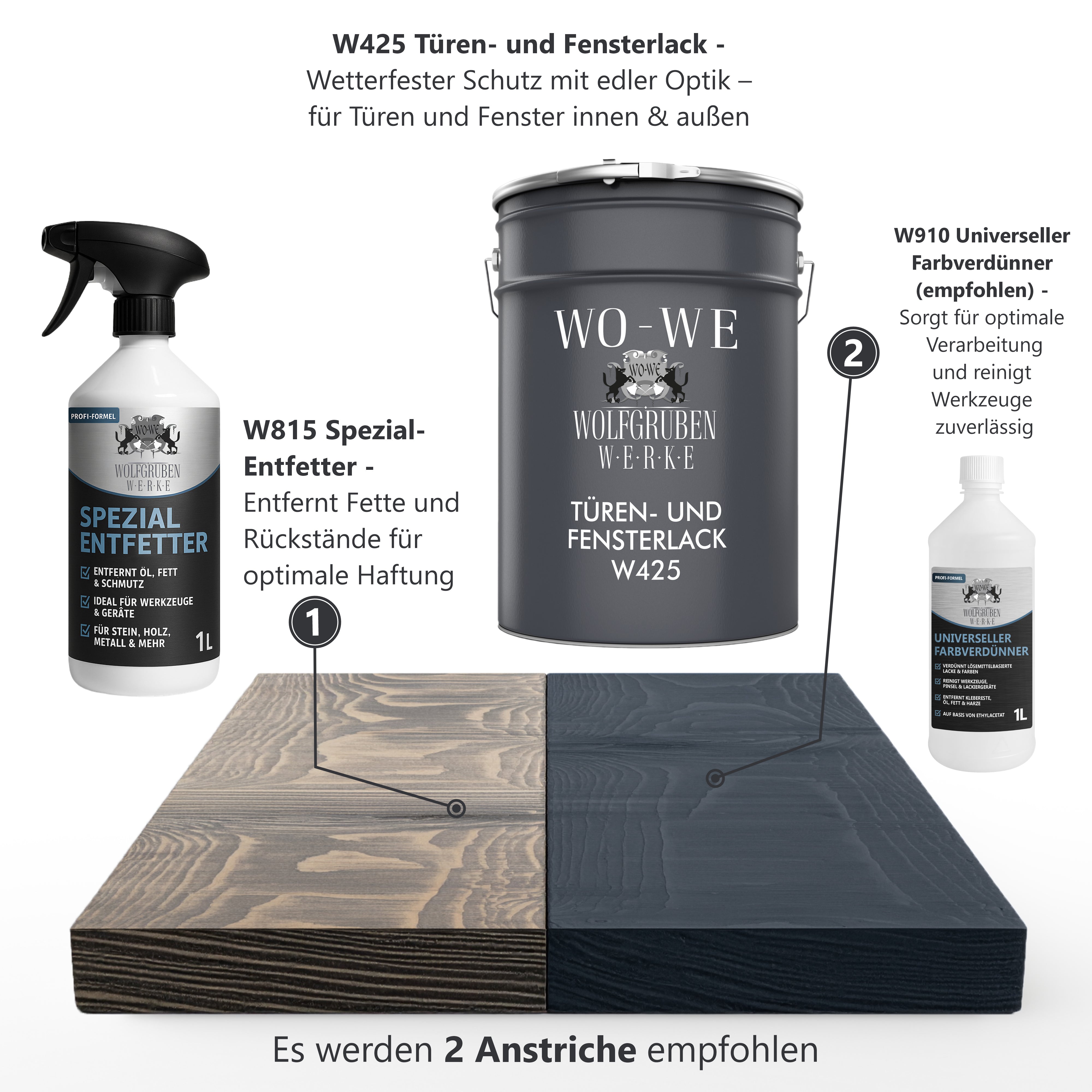 • La pintura para puertas y ventanas W425 de WO-WE ofrece una protección resistente a la intemperie discreta y eficaz para ventanas y puertas en interiores y exteriores.
