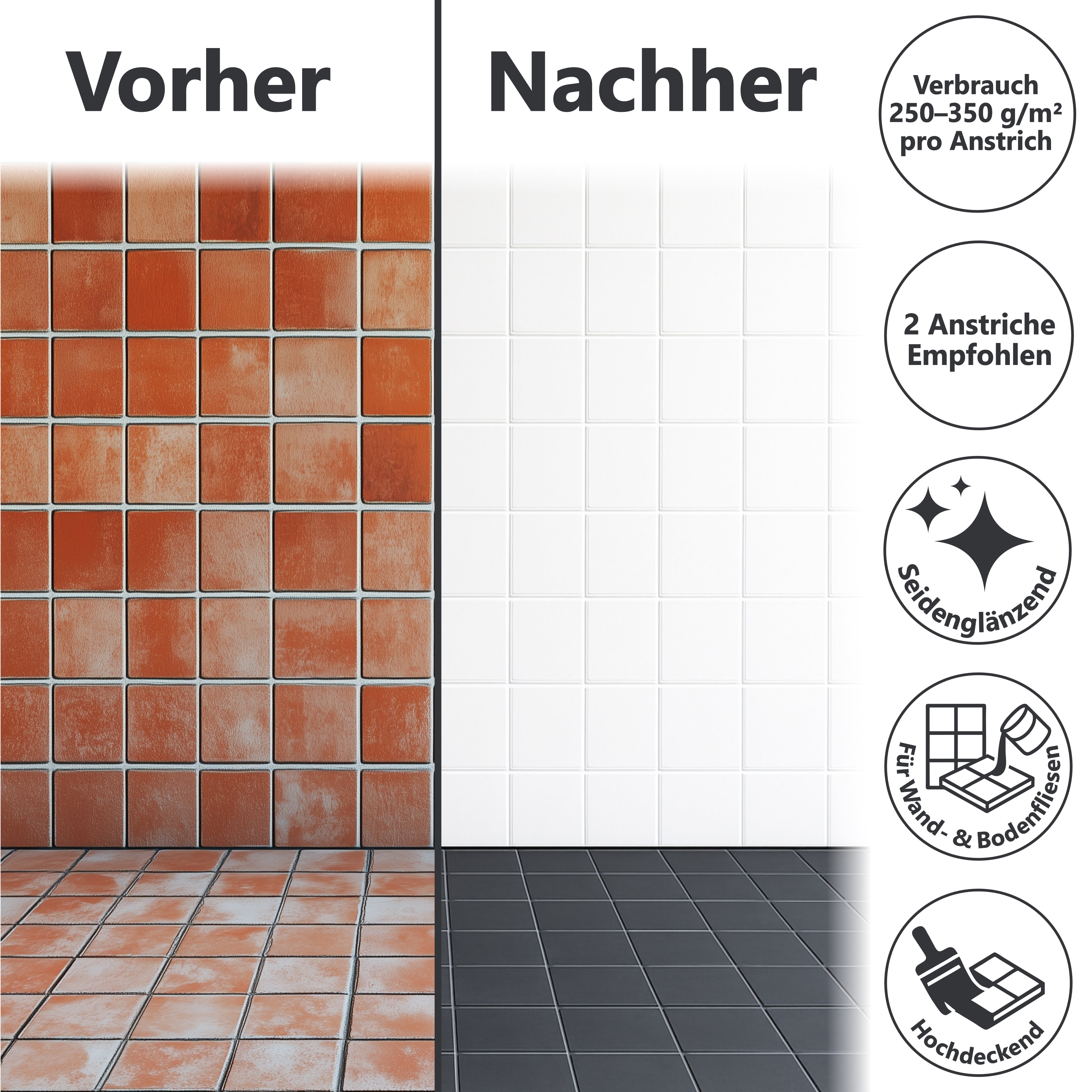 Une meilleure adhérence de la peinture pour carrelage peut être obtenue en ponçant la surface avec du papier de verre fin (grain 180-240) et en apprêtant avec notre Apprêt spécial pour carreaux de sol W708.