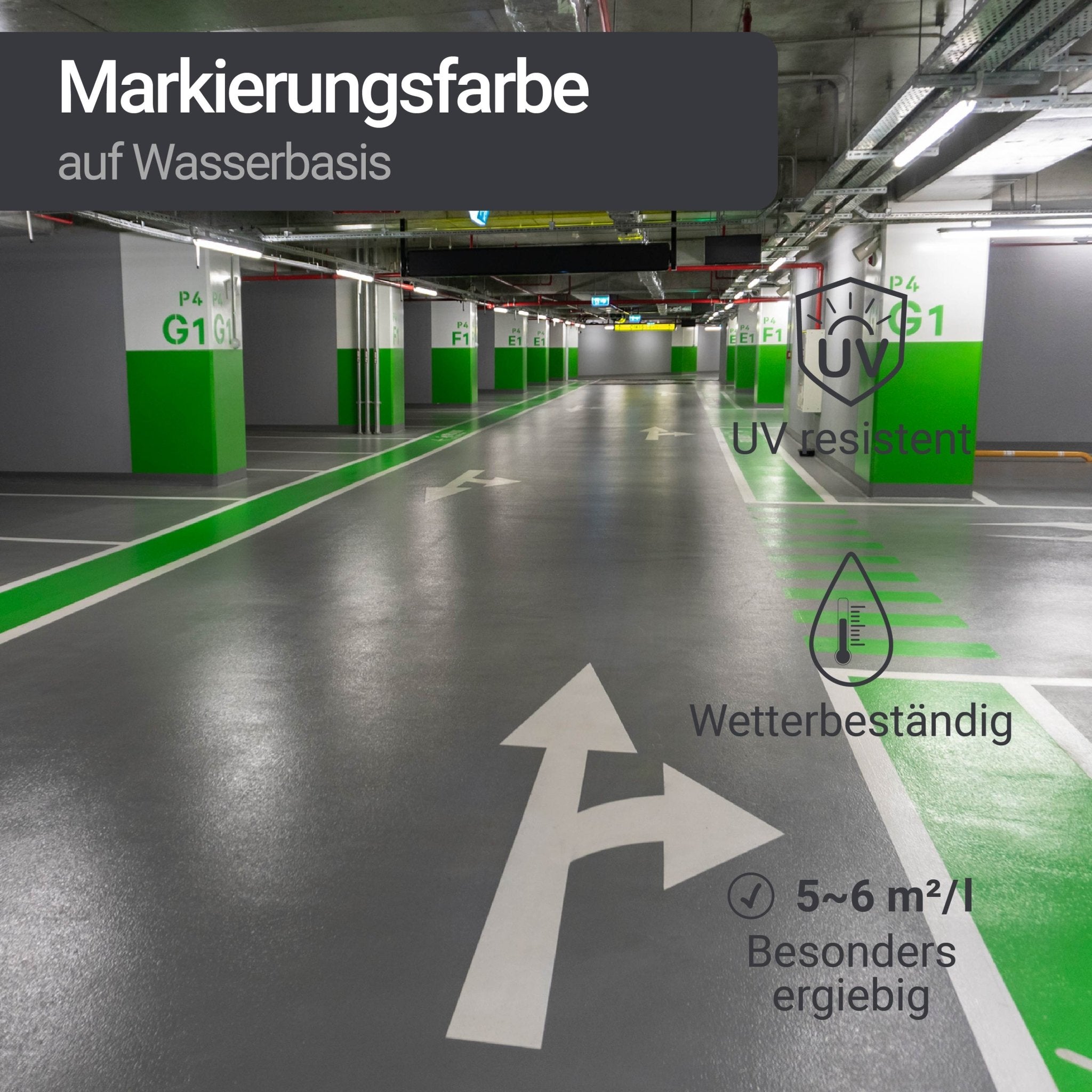• Bodenmarkierungsfarbe zur Markierung von Parkplätzen, Stellplätzen, Wegweisern, Fahrbahnen etc.