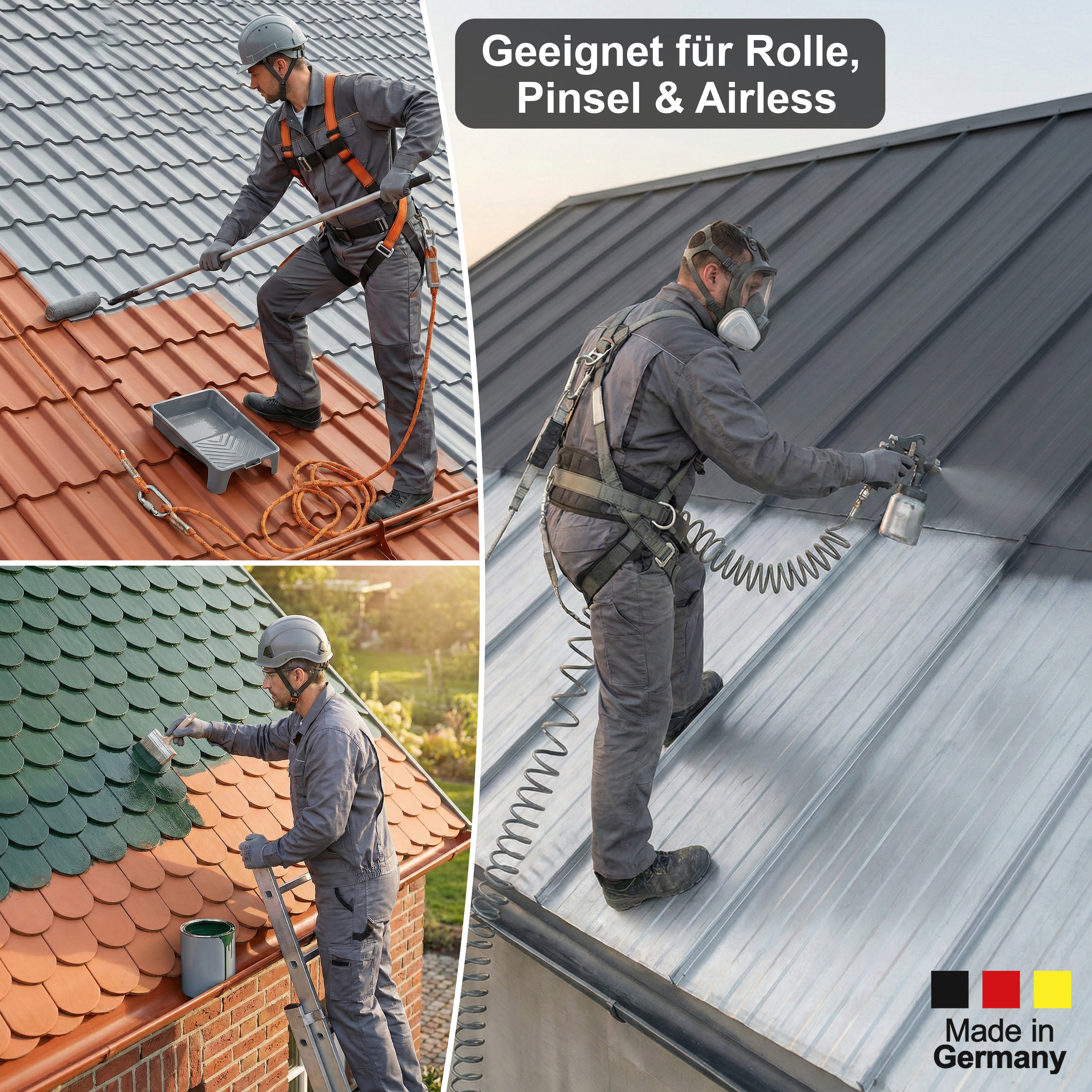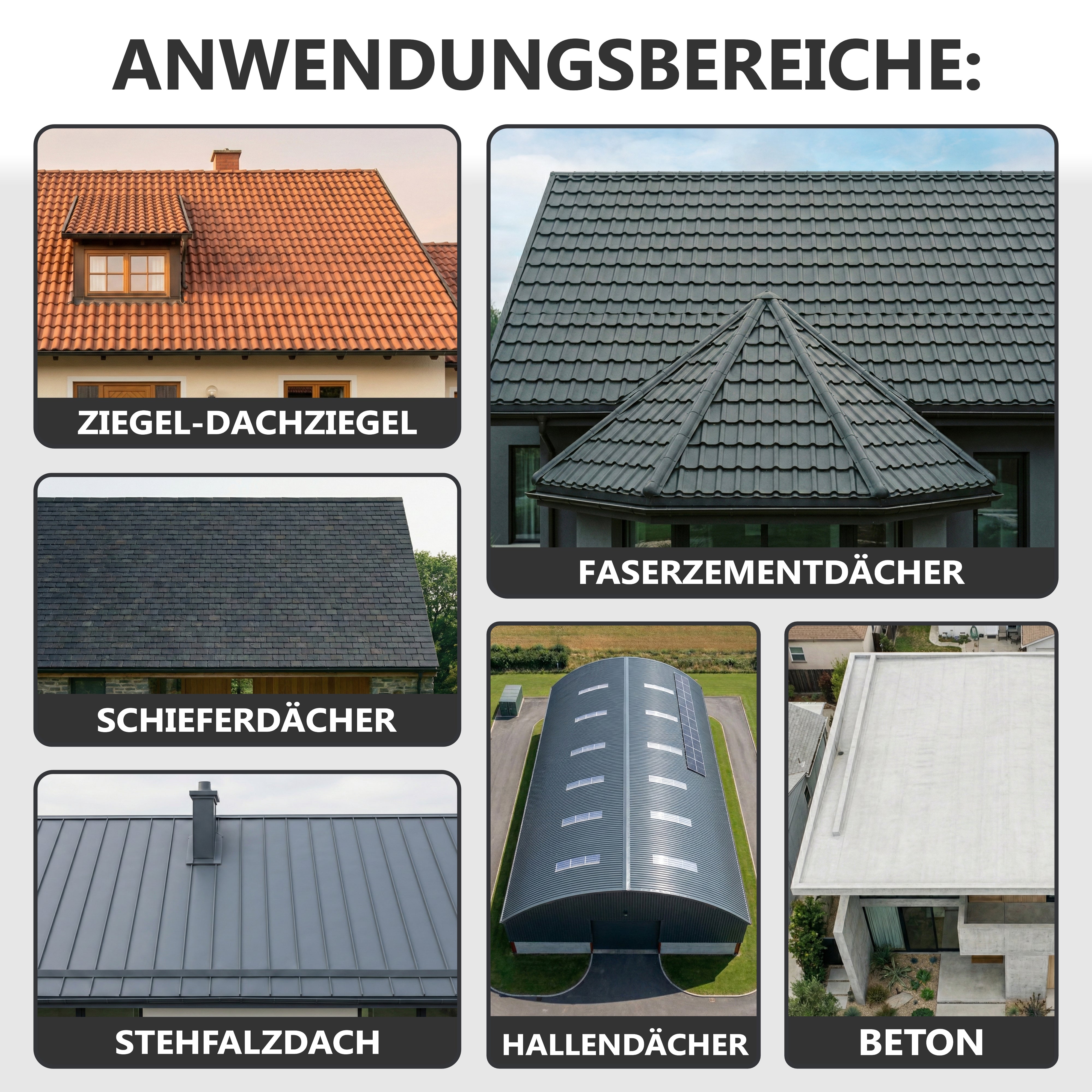Anwendbar auf Ziegeln, Dachpfannen, Eternit (kein Asbest), Metalldächern, etc.